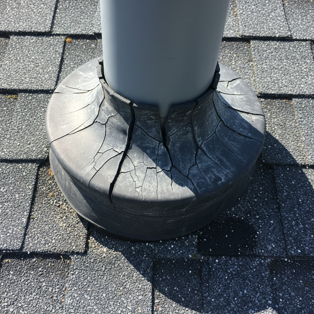 The vent boot (also called a vent pipe boot or roof boot) is the flexible rubber collar that fits around pipes and sits over flashing to prevent water entry. When it cracks or degrades—often from UV exposure, temperature cycling, or age—rainwater can run down the pipe and seep under shingles or flashing. Consequences include: