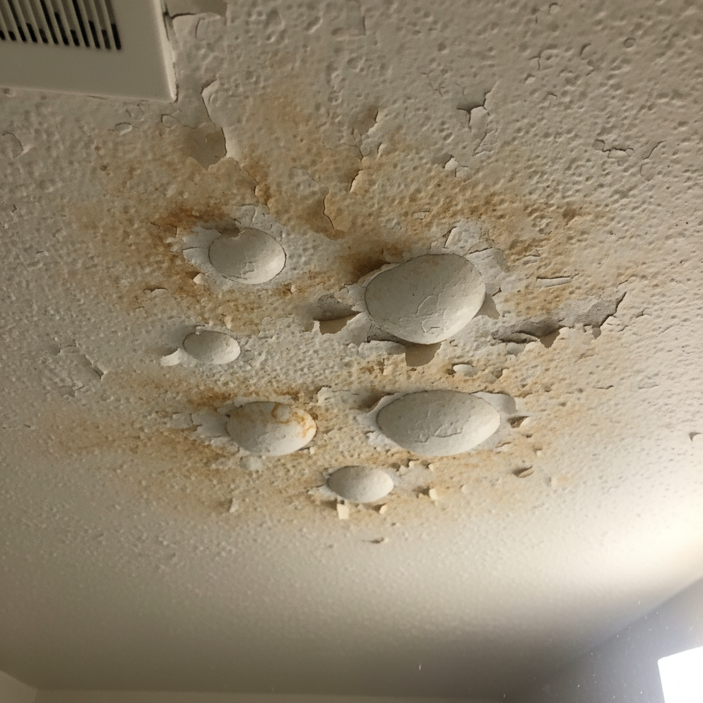 - Active water leaks: Plumbing leaks, roof leaks, or water from a shower/tub enclosure above can saturate the drywall or plaster. Paint bubbles often appear where water intrusion is present.