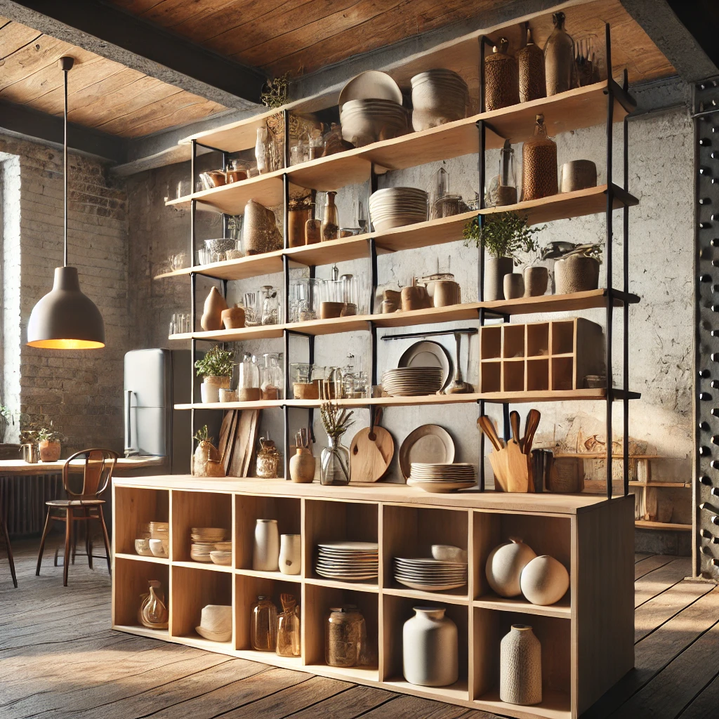 Replacing bulky cabinets with open shelves introduces a clean, modern aesthetic. Light wood shelving offers the perfect platform for displaying cookware, plants, or curated décor.