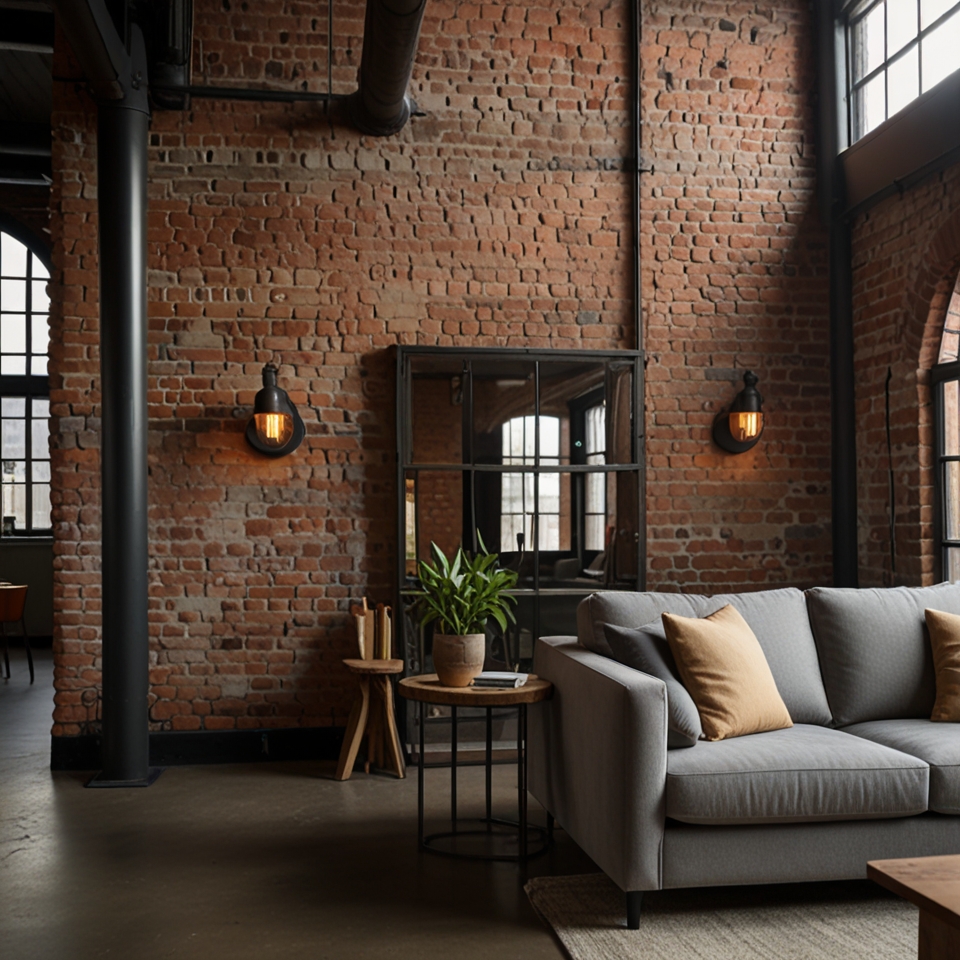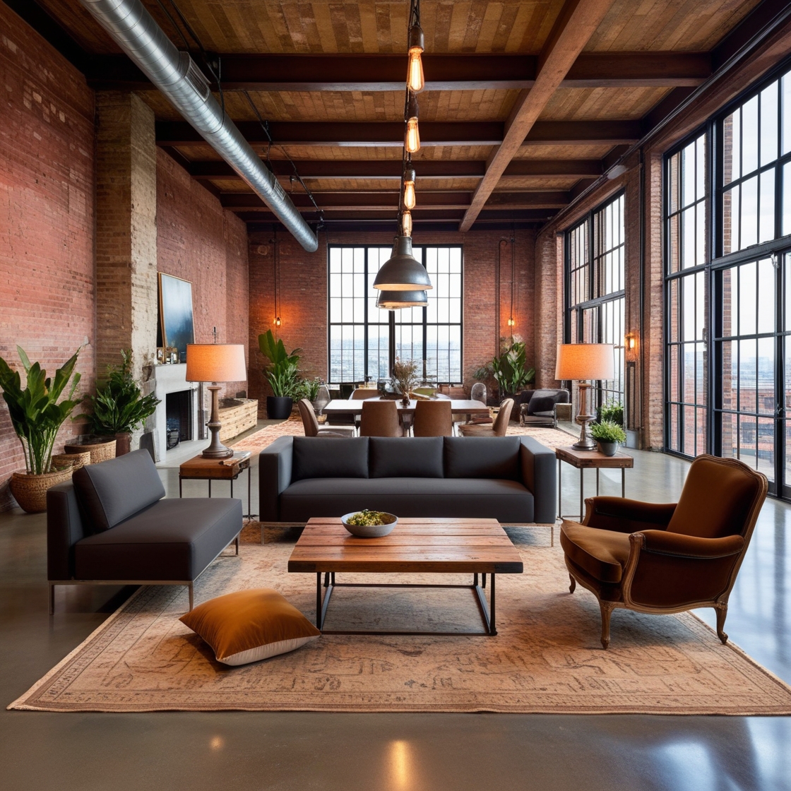- Exposed Materials: Brick walls, concrete floors, and steel accents.