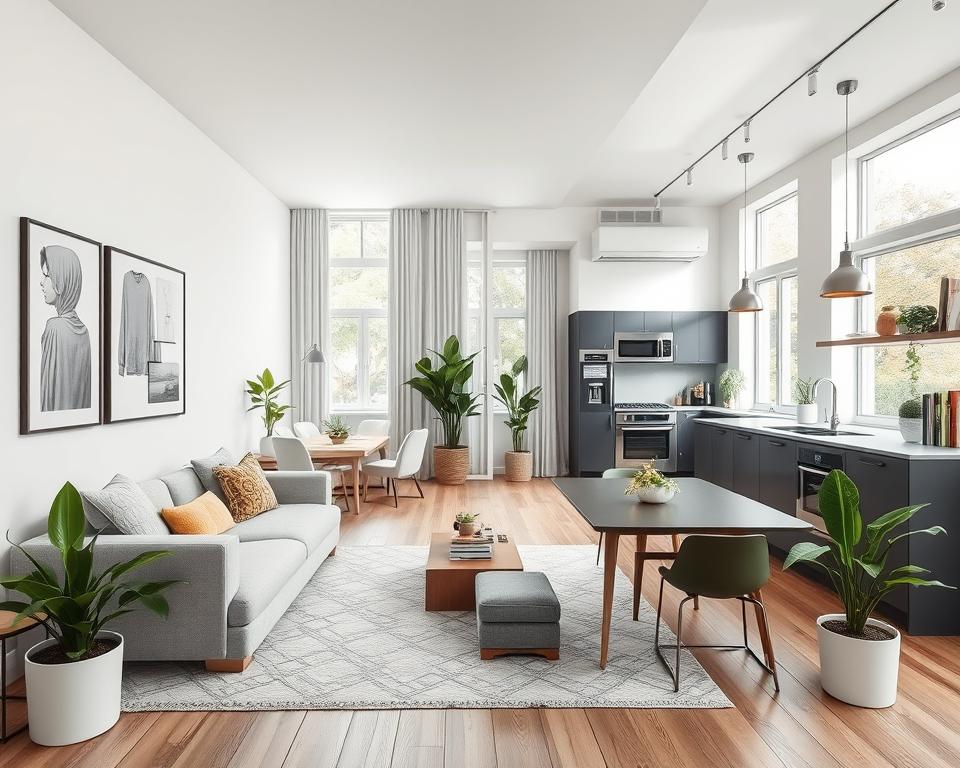 Today’s small apartment design trends lean towards simplicity and versatility. Clean lines, multi-use furniture, and tech integration are favored. This look boosts both beauty and calm in tight spaces.