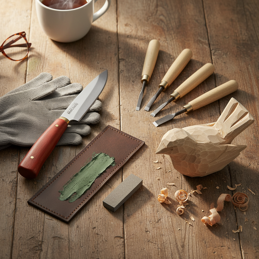 • Leather Strop and Compound: This is your best friend for maintaining a razor edge. After every carving session (or even every hour of carving), a few passes on a strop loaded with green or white polishing compound will bring your edge back to life.